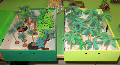 The trees and palms have come from toy sets or bought as oddments from 'Car Boot' sales or in charity shops. I also bought some Woodland Scenics palm (in box on left). Next step is to terrain the bases and add some scatter etc.
